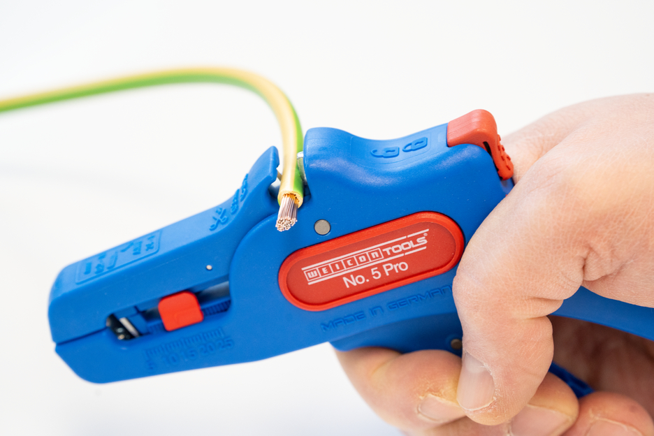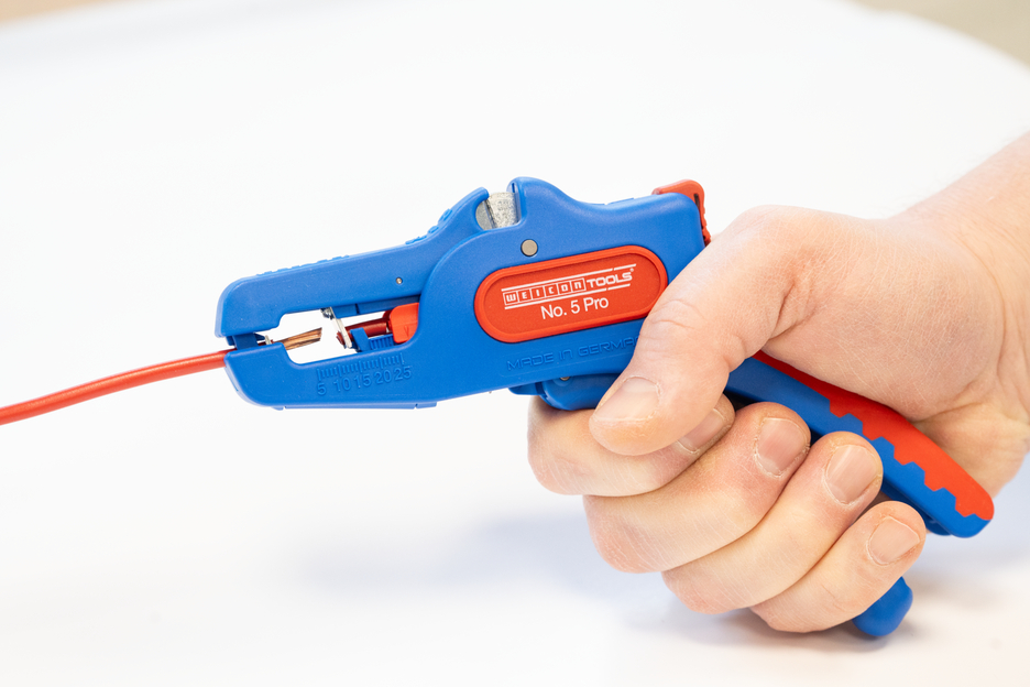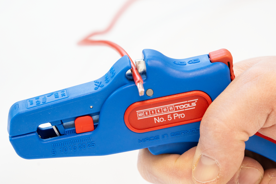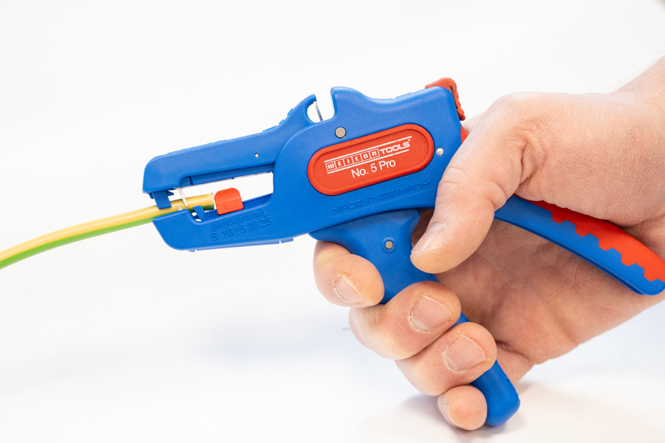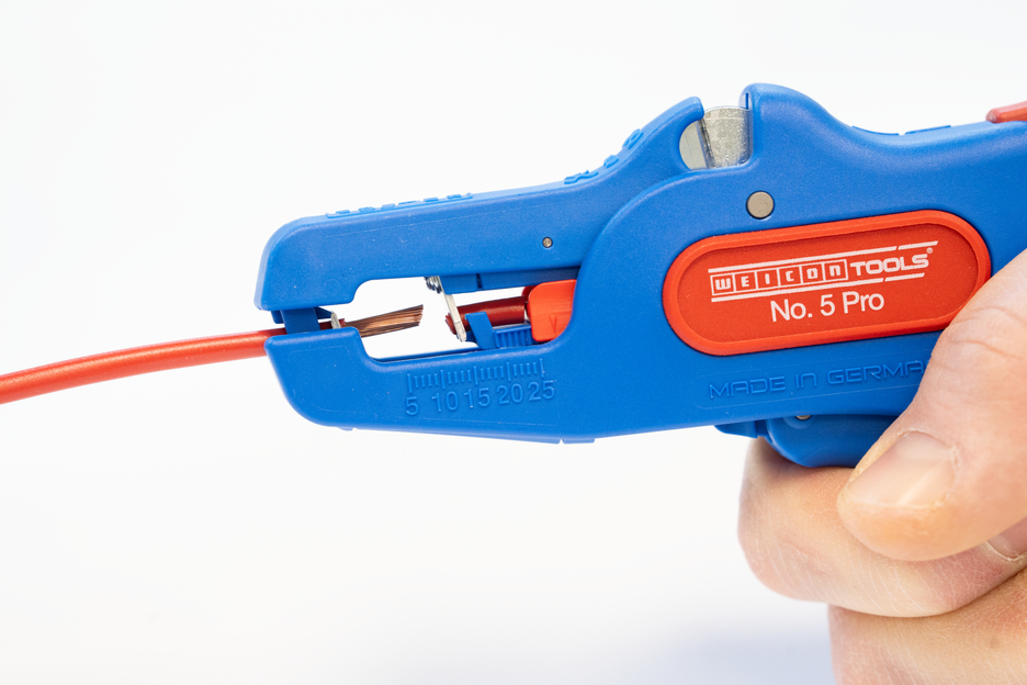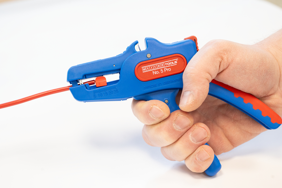 Wire Stripper otomatis dapat digunakan untuk mengupas semua konduktor untai dan padat dari 0,2 hingga 16 mm². Lenght Stop yang dapat disesuaikan dari 5 hingga 25 mm memungkinkan pekerjaan yang sangat tepat dan akurat. Lenght Stop dapat dilepas, jika diperlukan. Pengupas kawat secara otomatis menyesuaikan diri dengan penampang konduktor yang diperlukan - jadi tidak diperlukan penyesuaian manual. Alat pengupasan dilengkapi dengan pemotong samping yang terintegrasi, yang cocok untuk konduktor yang terbuat dari tembaga dan aluminium hingga diameter tiga milimeter. Berkat desain alat yang ramping, alat pengupas ini juga dapat digunakan di area kerja yang sulit diakses, seperti di lemari sakelar. Mekanisme alat pengupas berjalan sangat mulus dan telah terbukti tahan lama serta dapat diandalkan dalam berbagai pengujian. Pengupas kawat memiliki gagang multi-komponen yang tidak licin dengan desain "Ice Crack" berwarna biru-merah. Pengupas kawat memiliki lubang untuk memasang tali pengikat untuk perlindungan dari jatuh dan dilengkapi dengan permukaan pelabelan untuk dapat menyesuaikan alat. Selain itu, alat ini memiliki mekanisme penguncian untuk penyimpanan yang hemat tempat.