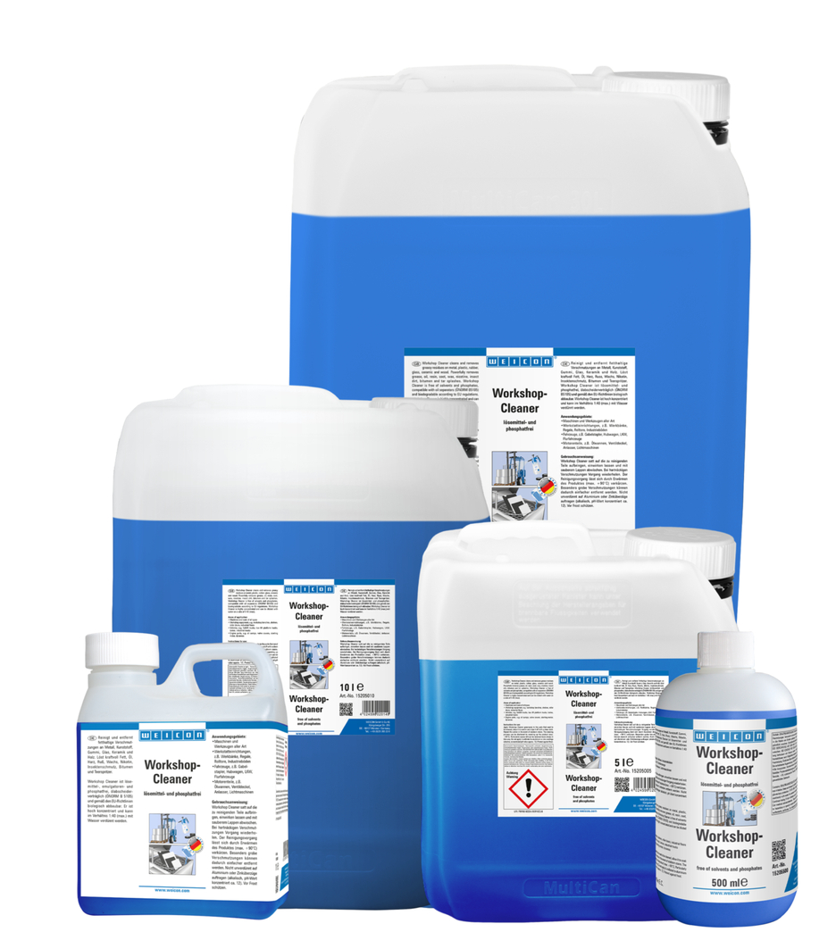 WEICON Workshop Cleaner membersihkan dan menghilangkan semua logam, plastik, jenis karet, kaca, keramik, dan kayu. Secara efektif menghilangkan lemak, minyak, resin, jelaga, lilin, nikotin, kotoran serangga, aspal dan cipratan tar. WEICON Workshop Cleaner bebas dari pelarut, pengemulsi dan fosfat yang kompatibel dengan pemisah minyak (ÖNORM B 5105) dan, sesuai dengan pedoman EC, dapat terurai secara biologis. Produk ini sangat pekat dan dapat diencerkan dengan air dengan perbandingan 1:40 (maksimal). Produk ini mengandung tensida tanpa busa yang dipilih dan, selain pembersihan manual, dapat digunakan pada pembersih bertekanan tinggi, mesin cuci bagian dan peralatan semprot (misalnya Dispenser Pompa WPS 1500).