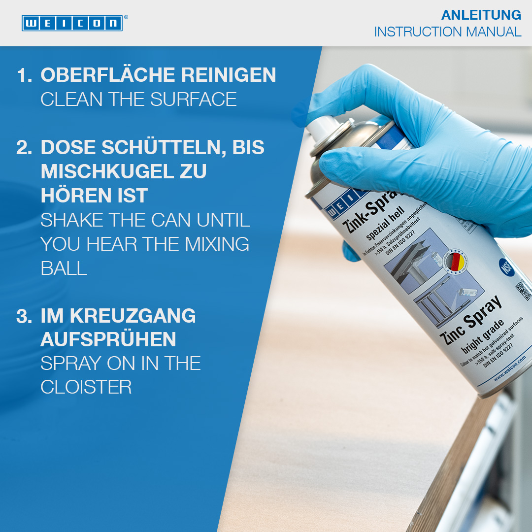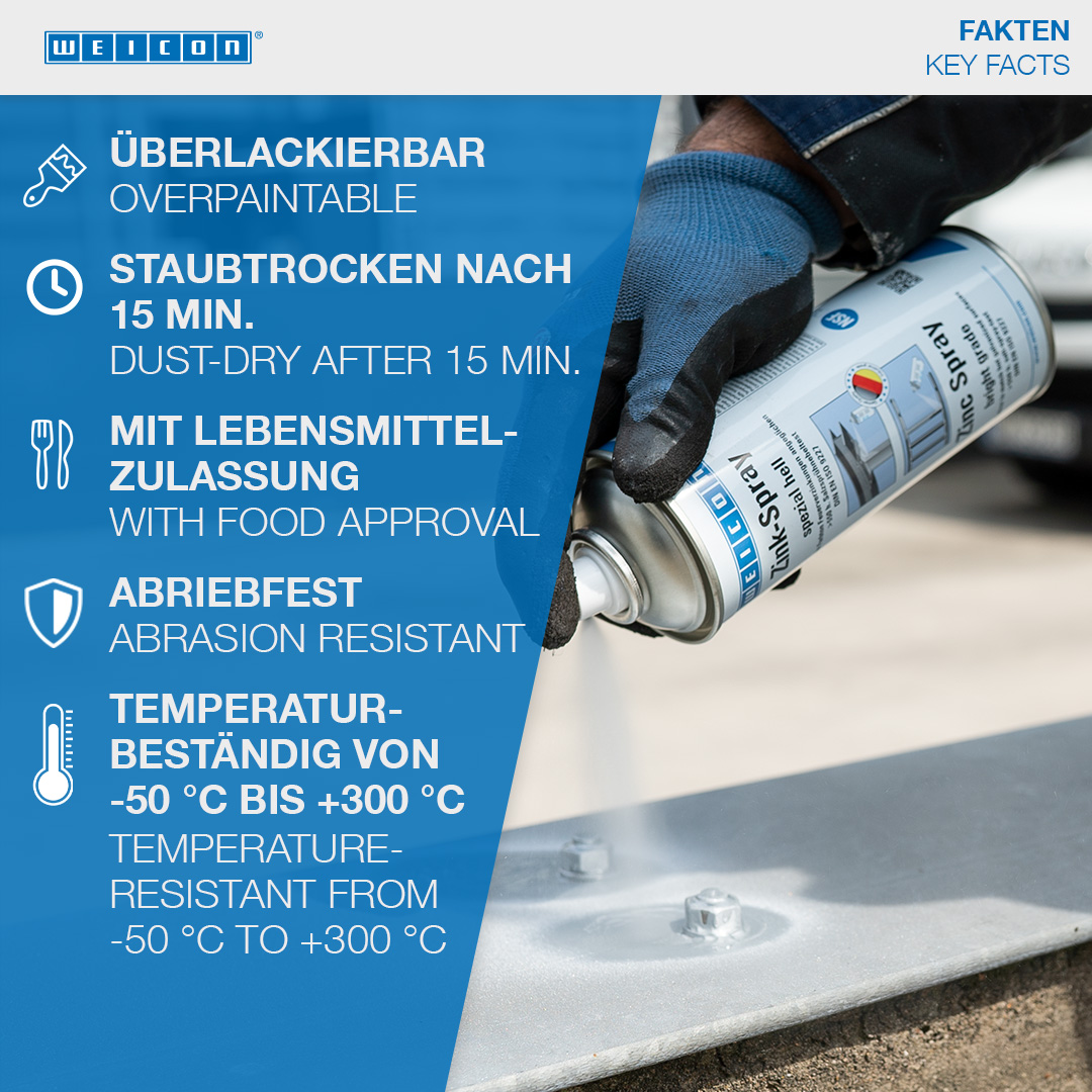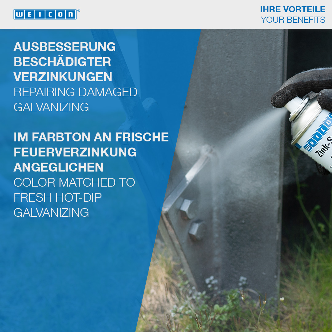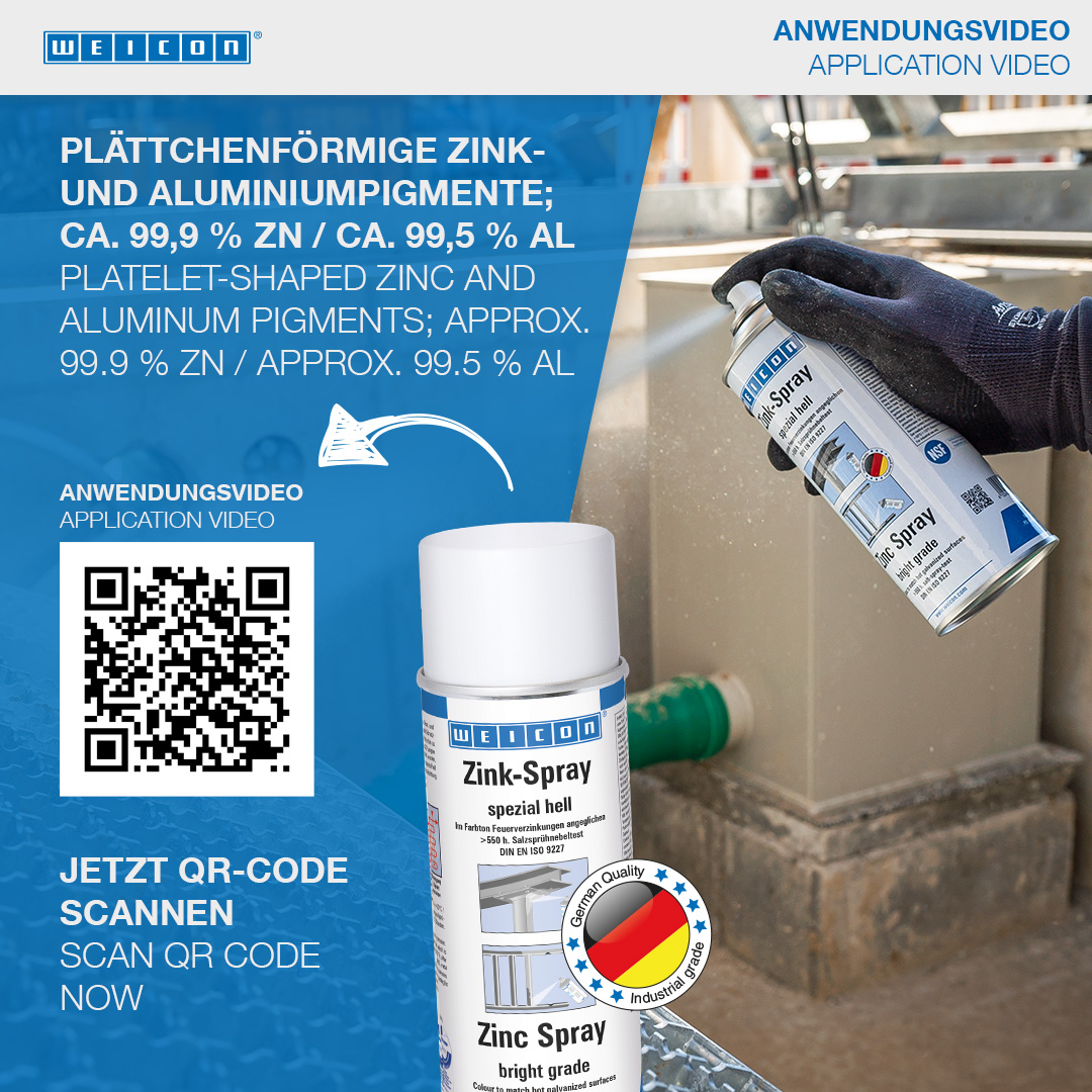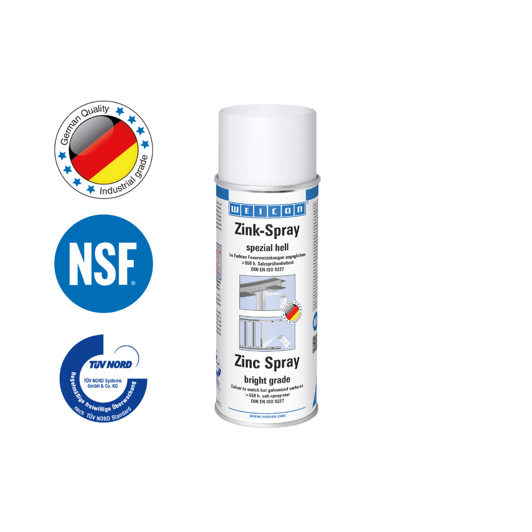WEICON Zinc Spray "bright grade" telah disetujui oleh TÜV Jerman dan memberikan perlindungan korosi katodik yang tahan lama pada semua permukaan logam. Produk ini memiliki warna cerah yang sesuai dengan galvanisasi hot-dip yang baru. Ini membentuk lapisan pelindung yang cepat kering dan melekat dari serpihan seng mikro halus. Serpihan seng membentuk lapisan pelindung yang tahan bahkan terhadap cuaca dan kondisi lingkungan yang ekstrem. Bahkan setelah lebih dari 550 jam dalam uji semprotan garam menurut DIN EN 9227, bagian logam yang dilapisi dengan WEICON Zinc Spray "bright grade" tidak menunjukkan adanya korosi. WEICON Zinc Spray "bright grade" dapat digunakan untuk pelapisan sambungan las dan lubang bor, sebagai lapisan perantara konduktif untuk pengelasan titik dan di mana pun logam harus dilindungi dari korosi.